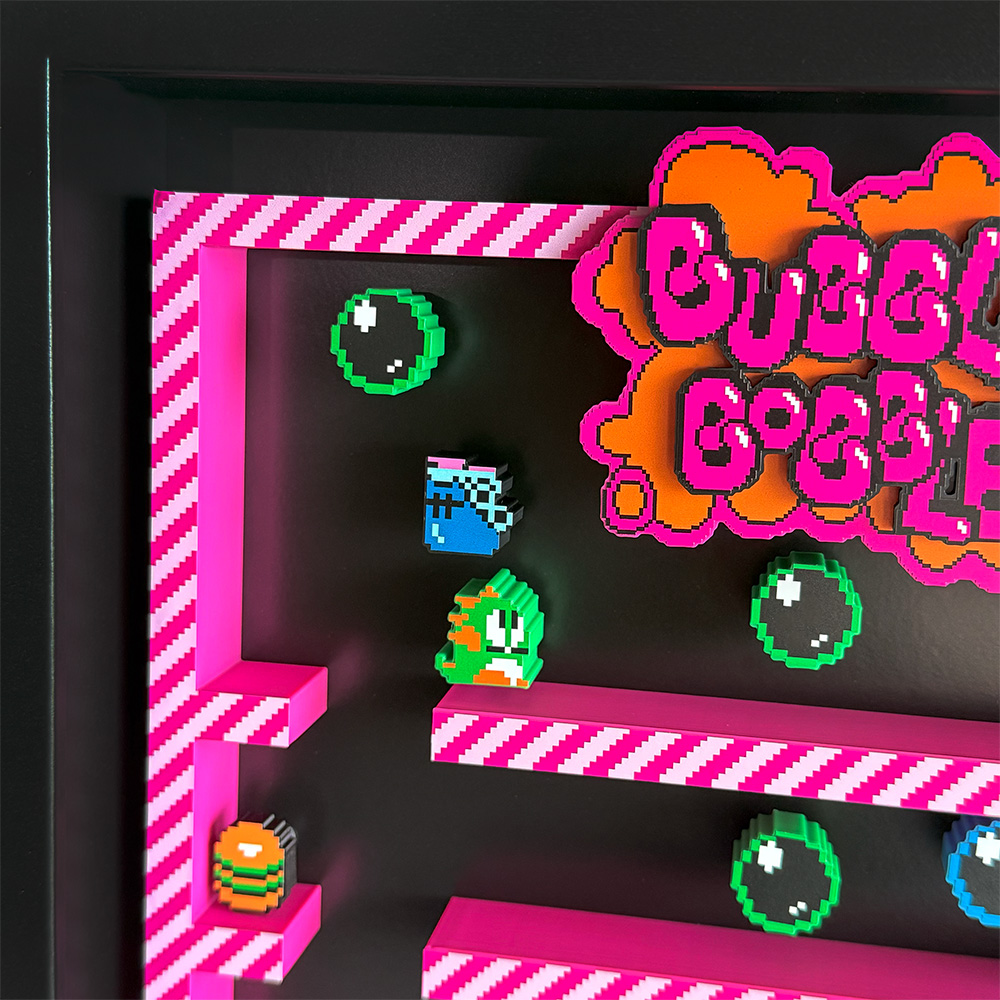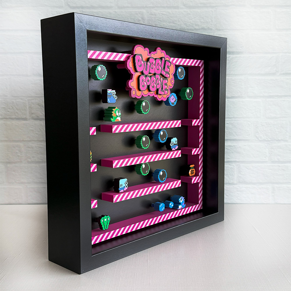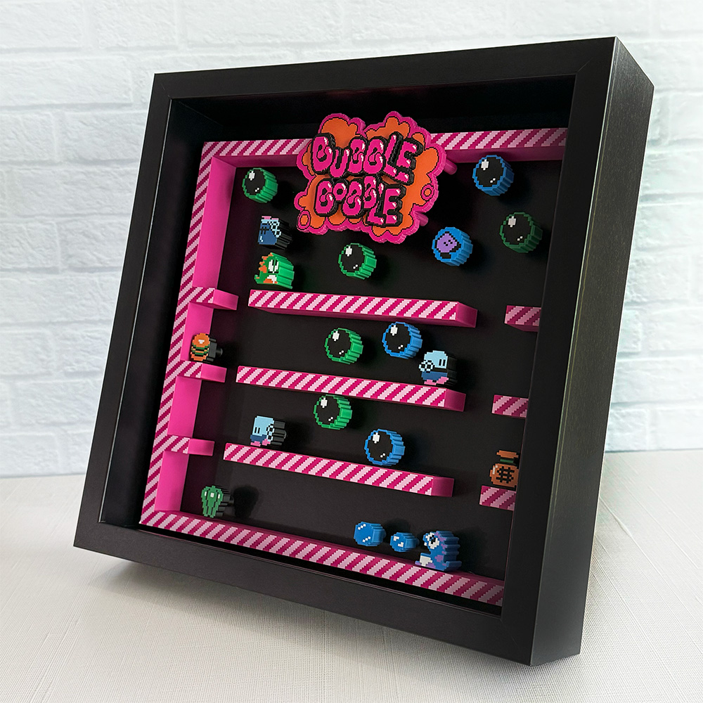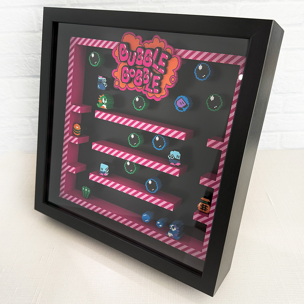 Join Bub and Bob on a fun-filled adventure with our stunning shadow box featuring a gameplay snapshot with a 3D effect.