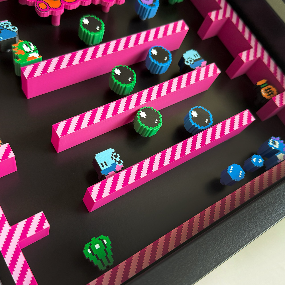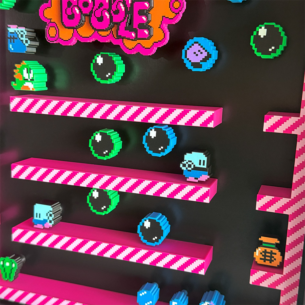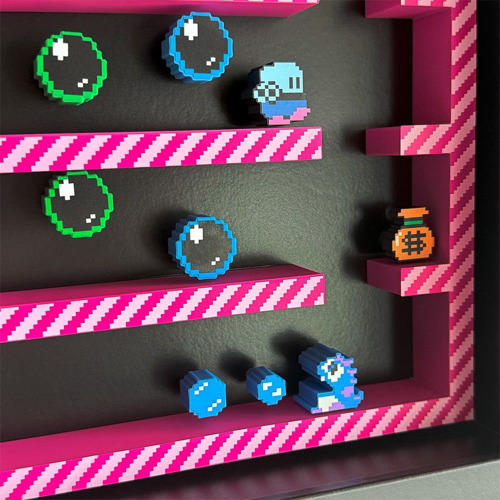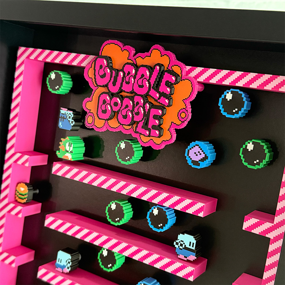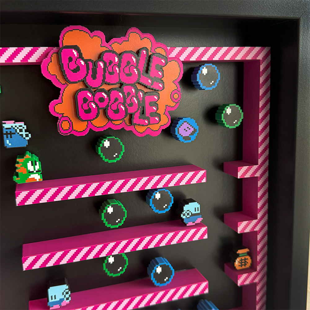 Join Bub and Bob on a fun-filled adventure with our stunning shadow box featuring a gameplay snapshot with a 3D effect.