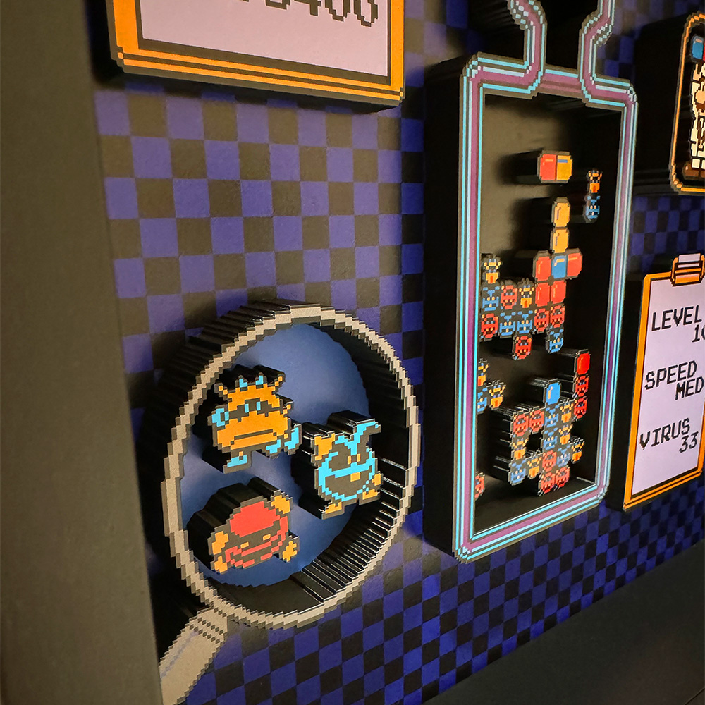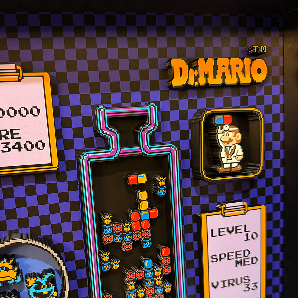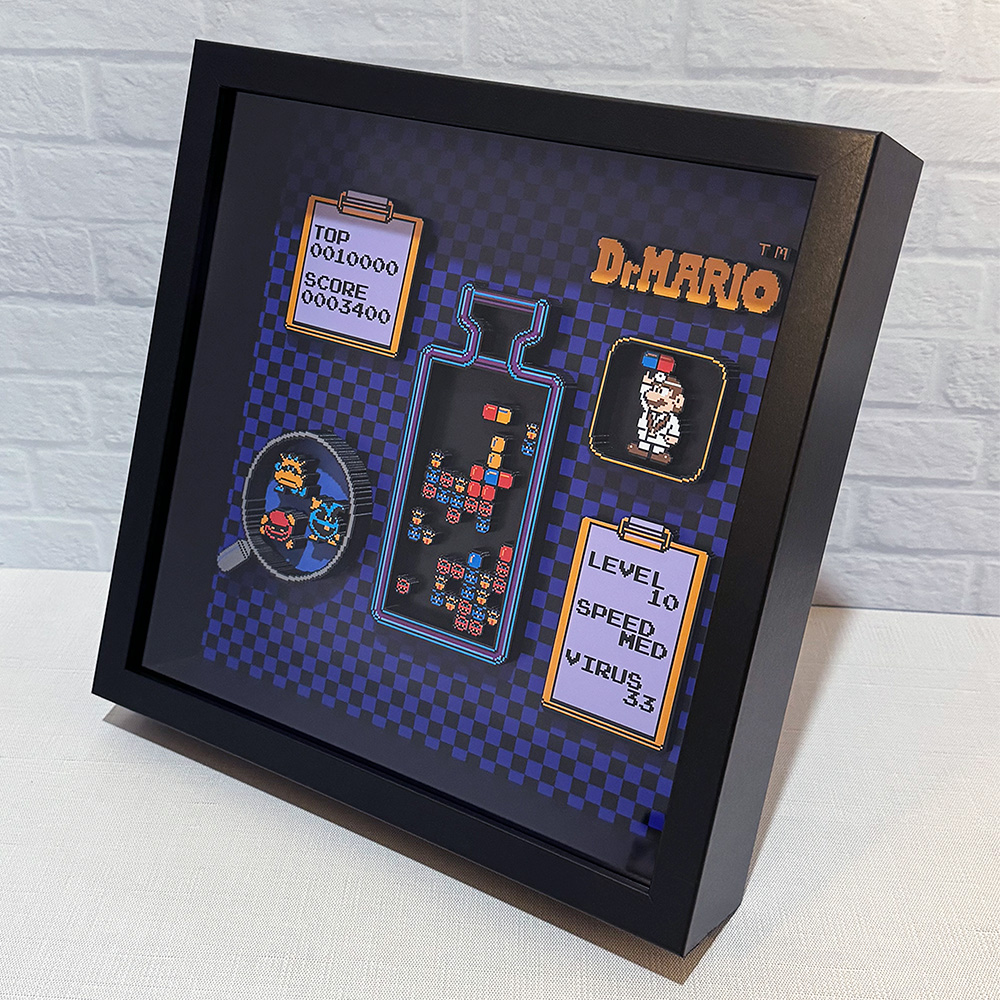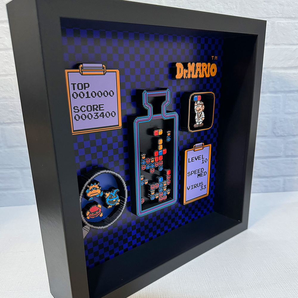 Step into the world of Dr. Mario with our stunning shadow box featuring a gameplay snapshot with a 3D effect.