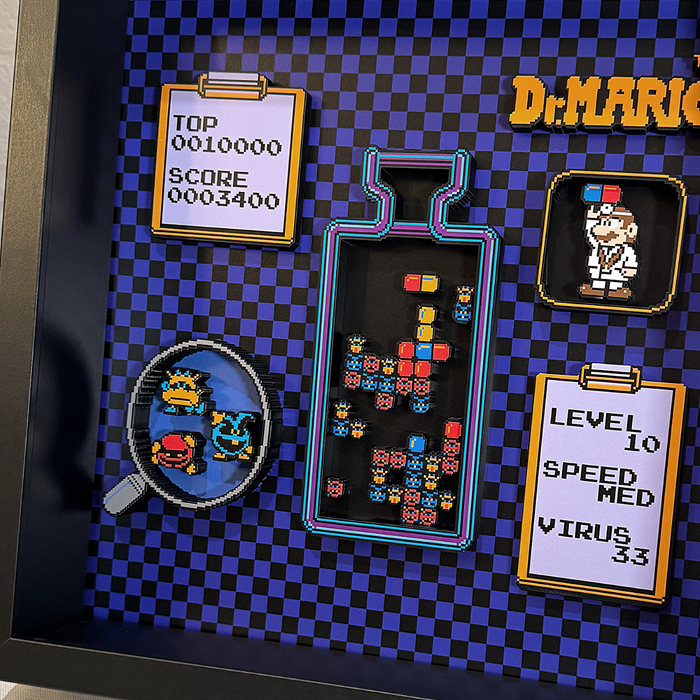 Whether you’re a long-time fan of Dr. Mario or simply appreciate innovative art pieces, this shadow box is sure to impress with its blend of nostalgia and creativity. It serves as both a decorative statement piece and a homage to a popular gaming title.